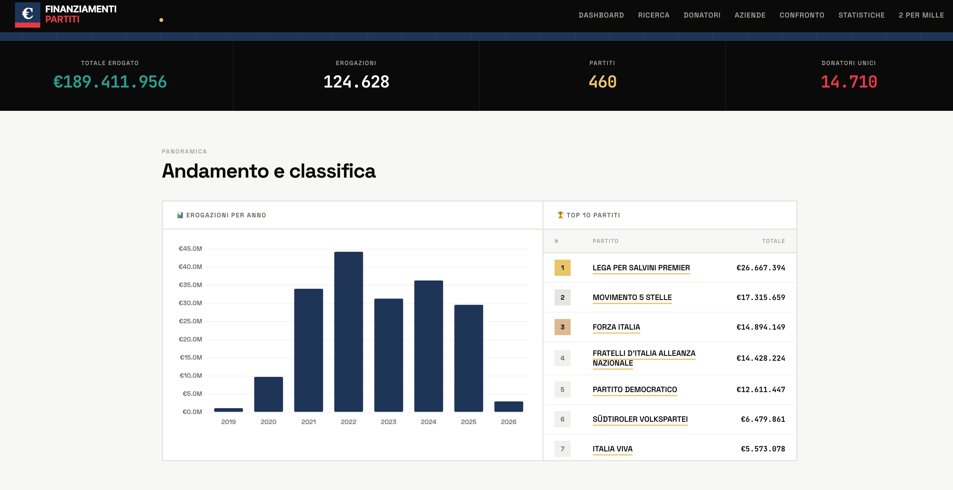 Il sito aggrega tutti i finanziamenti comunicati alla Camera dal 2019 a oggi. I numeri sono questi: 189 milioni di euro erogati, 124.628 singole transazioni, 460 partiti e movimenti, 14.710 donatori unici.