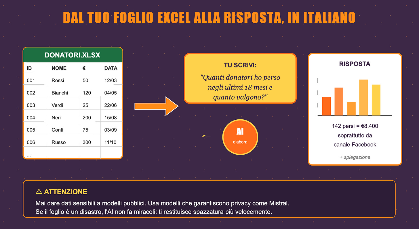 Caricare un foglio con i tuoi donatori, le loro donazioni, le campagne, e iniziare a fare domande in italiano normale, come se stessi parlando con un collega. Attenzione alla privacy però. Mai dare dati sensibili e usare sempre modelli che la garantiscano (tipo Mistral, che è europeo e si può anche far girare in locale).