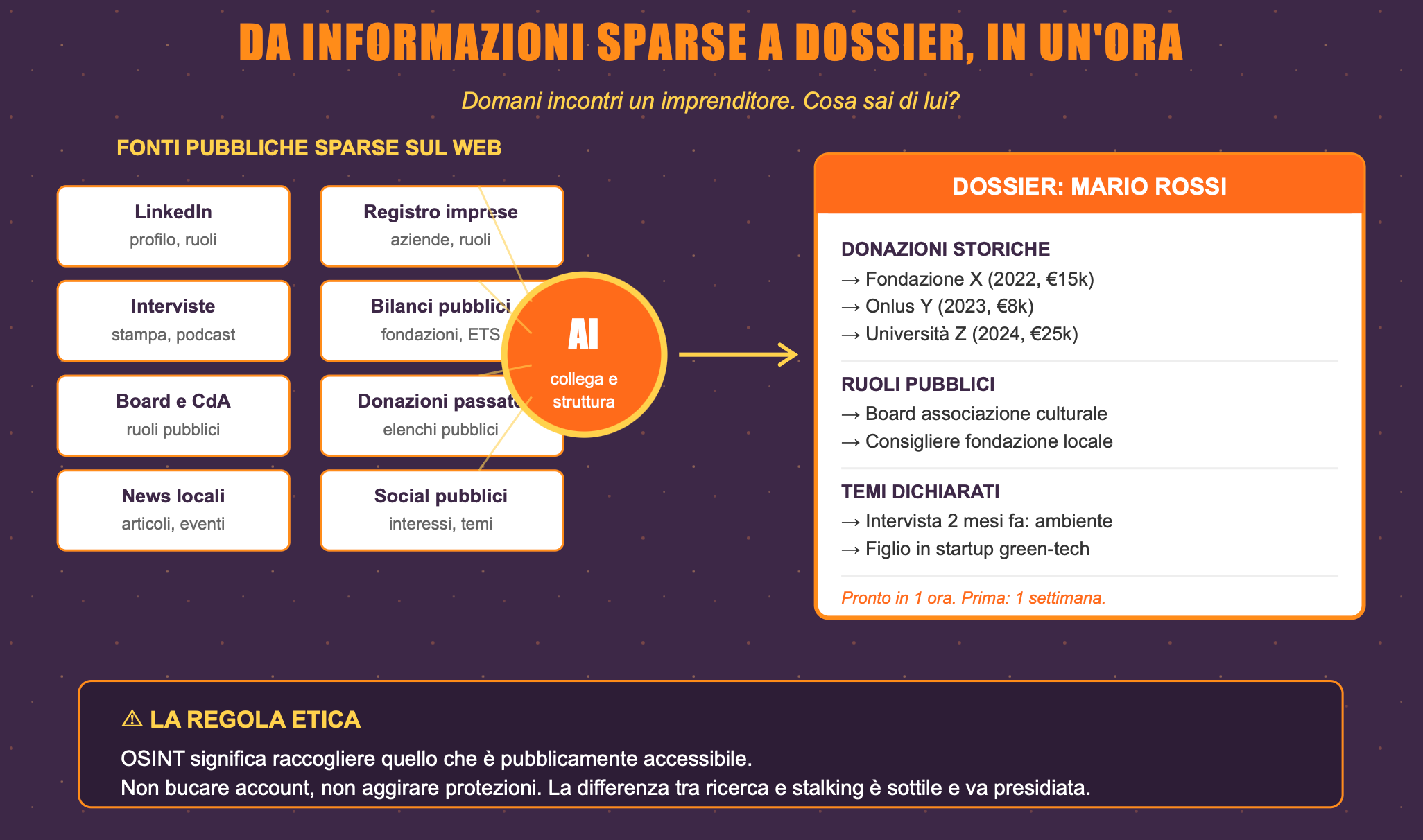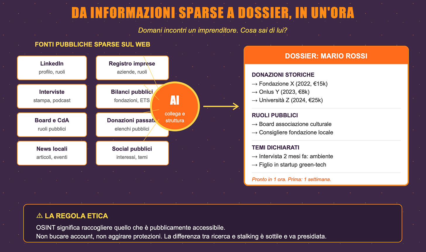 Esempio concreto. Domani incontri un imprenditore che potrebbe fare una donazione importante. Dai all’intelligenza artificiale il suo nome e quello della sua azienda. Nel giro di un’ora hai un documento che ti dice: ha donato a queste tre fondazioni negli ultimi cinque anni, siede nel board di questa associazione culturale, ha rilasciato un’intervista due mesi fa dicendo che lo preoccupa il tema X, suo figlio ha appena fondato una startup nel settore Y. Arrivi all’incontro con domande giuste e argomenti pertinenti, non con il pitch standard che avresti tirato fuori senza saperne nulla.