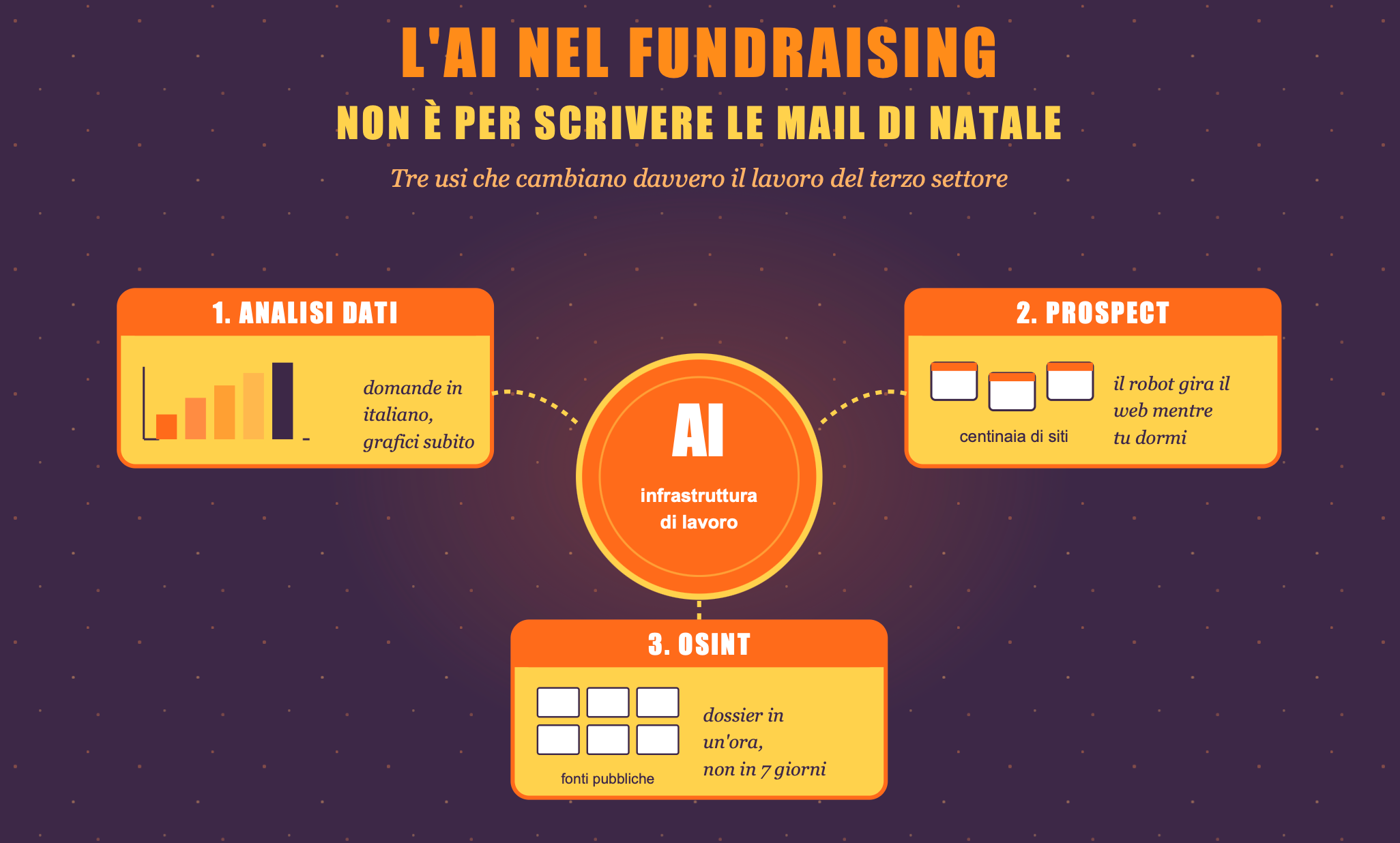 Analisi dati, ricerca prospect e OSINT: tre modi per smettere di usare l'IA come un giocattolo e trasformarla in un'infrastruttura di lavoro per il Terzo Settore.