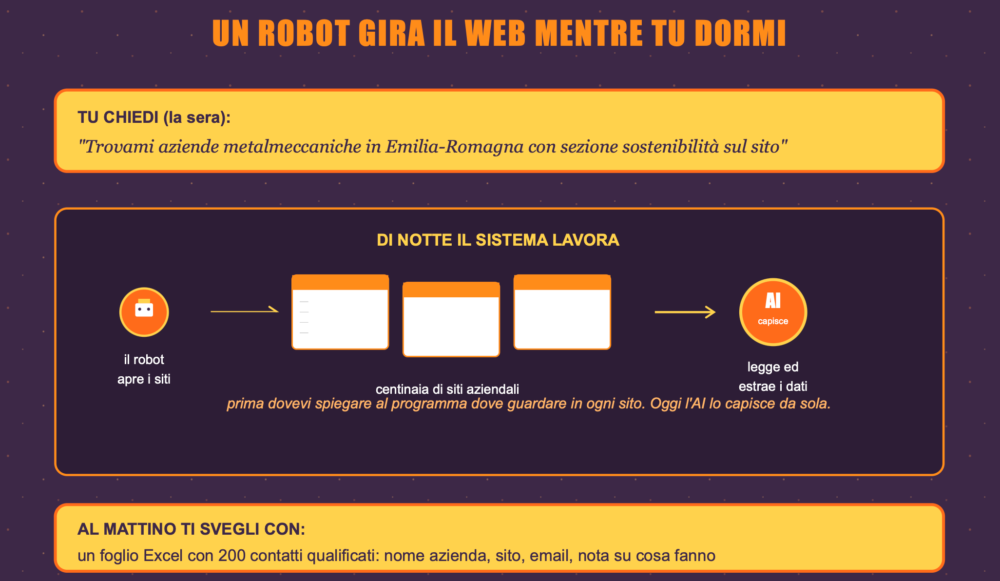 Esempio concreto. Vuoi tutte le aziende metalmeccaniche dell’Emilia-Romagna con almeno cinque milioni di fatturato che hanno una sezione “sostenibilità” sul loro sito. Lanci il sistema la sera, la mattina ti svegli con duecento contatti già qualificati, con nome dell’azienda, sito, email del contatto giusto, e una nota su cosa fanno in tema di responsabilità sociale.
