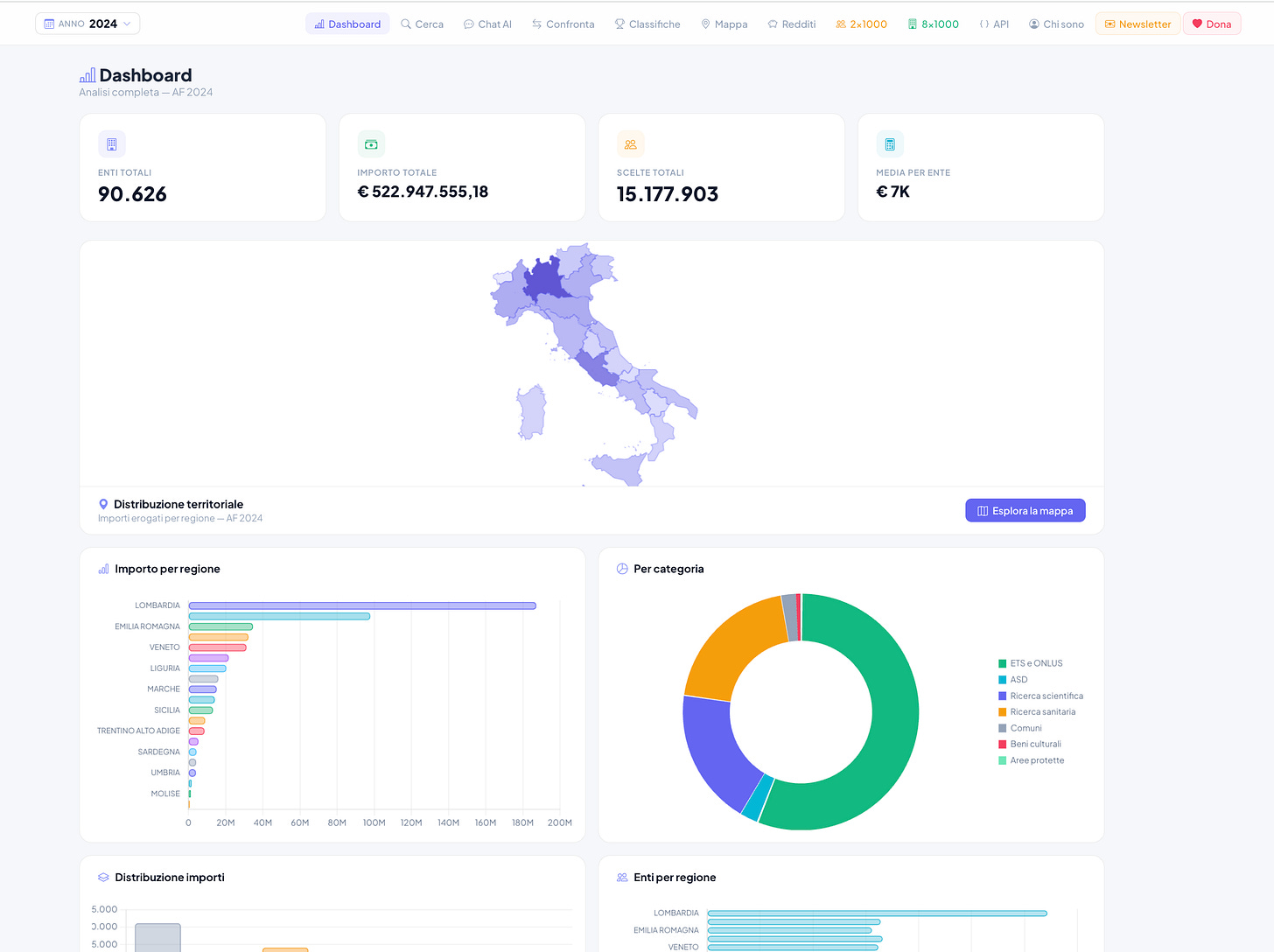 Ho preso tutti i dati pubblicati dall’Agenzia delle Entrate dal 2006 al 2024 — oltre un milione di record — e li ho messi in un posto dove si possono effettivamente usare. Si chiama risultati5x1000.it. Si cerca un ente, si vedono i grafici, si confrontano gli anni. Ci sono anche i dati del 2x1000 e dell'8x1000. C'è un assistente AI a cui fare domande sui dati e ci sono API pubbliche per chi vuole costruirci sopra.